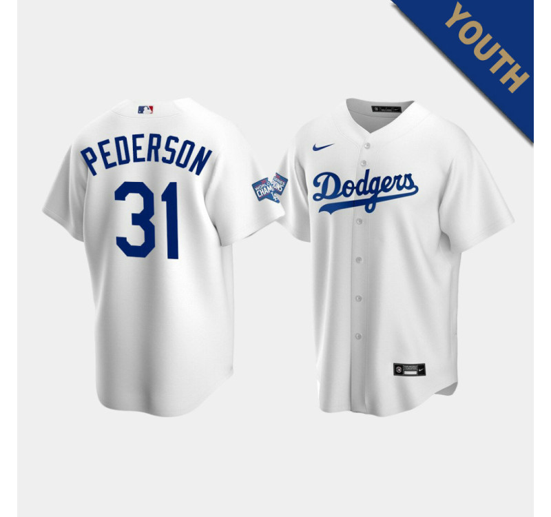 - Kid's Dodgers Joc Pederson #31 White 2020 World Series Champions Home Replica Jersey
