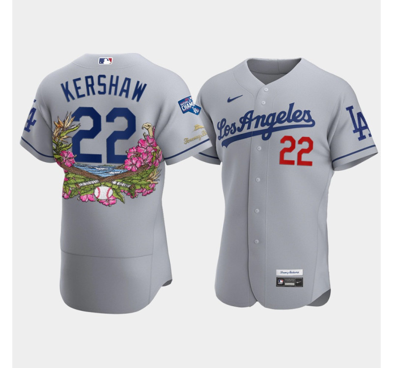 - Men's Dodgers #22 Clayton Kershaw Gray 2020 World Series Champions Authentic Tommy Bahama Jersey