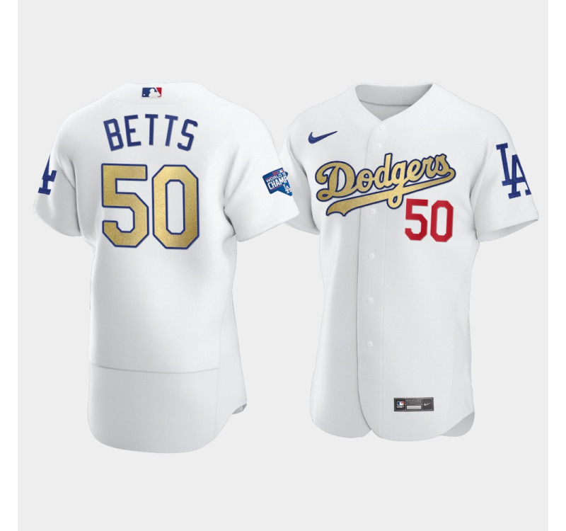 - Men's Dodgers Mookie Betts White 2021 Gold Program Authentic Patch Jersey