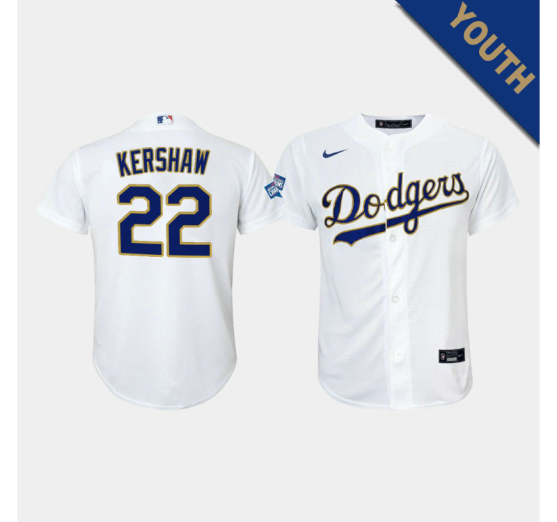 - Kid's Dodgers Clayton Kershaw #22 White 2021 Gold Program Replica Jersey