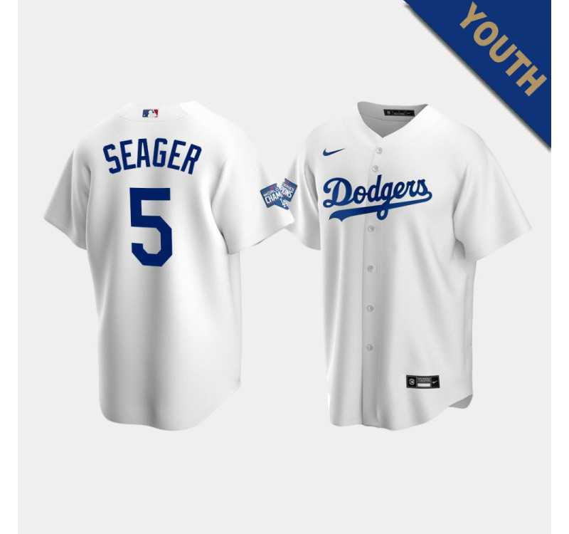 - Kid's Dodgers Corey Seager #5 White 2020 World Series Champions Home Replica Jersey