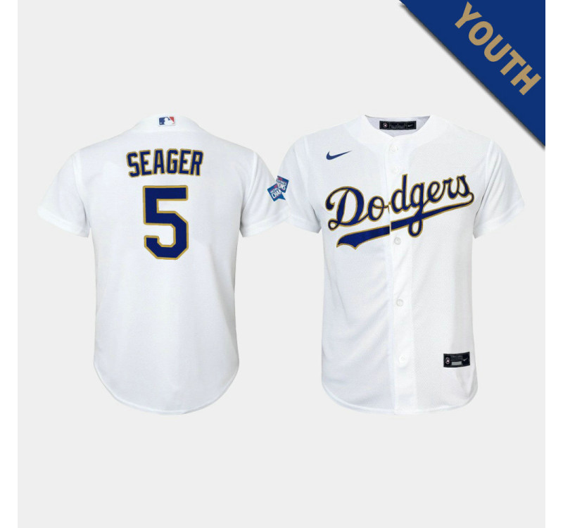 - Kid's Dodgers Corey Seager #5 White 2021 Gold Program Replica Jersey