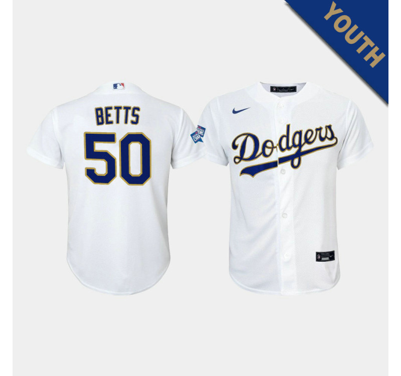 - Kid's Dodgers Mookie Betts #50 White 2021 Gold Program Replica Jersey