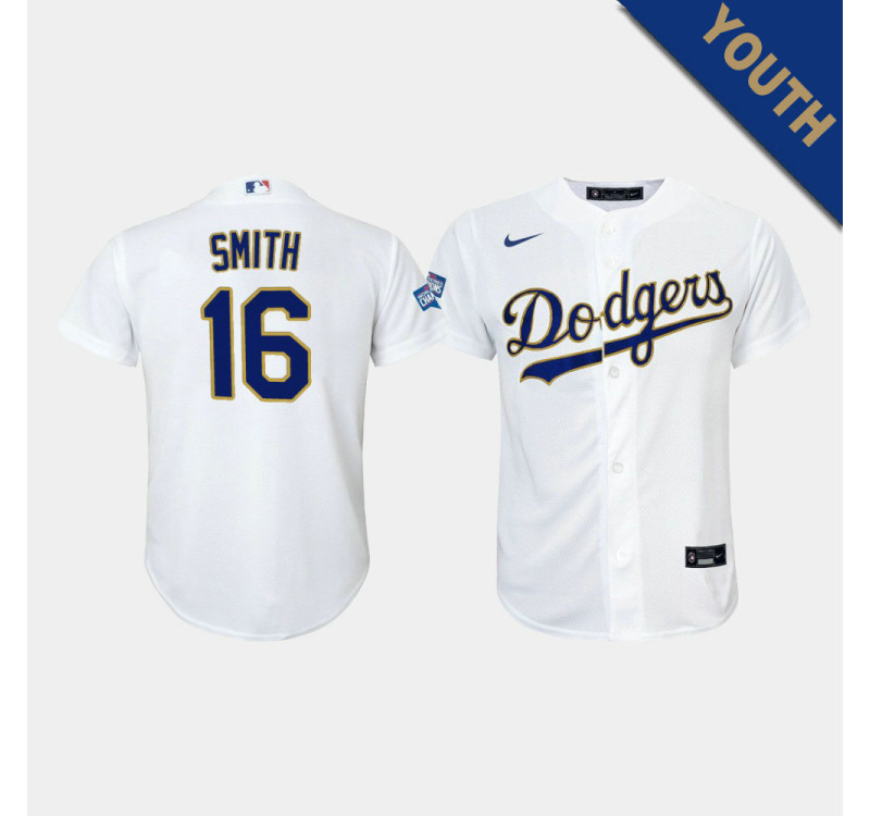 - Kid's Dodgers Will Smith #16 White 2021 Gold Program Replica Jersey